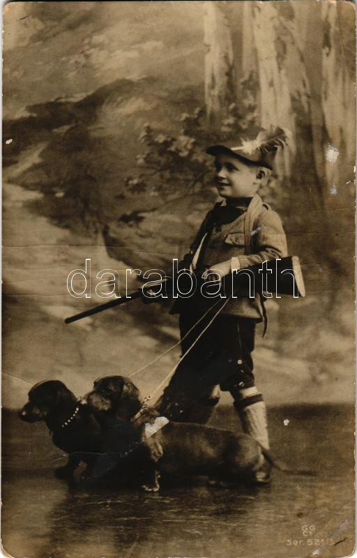 1909 Boy dressed as hunter with Dachshund dogs. photo (gyűrődések / creases)