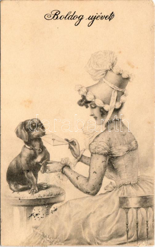 https://www.darabanth.com/en/514-Auction-philately-postcards-numismatics-artwork-books-colletibles-jewelry/515.0/Postcards/Greeting-Cards-Holidays~1191/1912-Boldog-Ujevet-New-Year-greeting-art-postcard-with-lady-and-Dachshund-dog-M-Munk-Vienne-N~II3226588