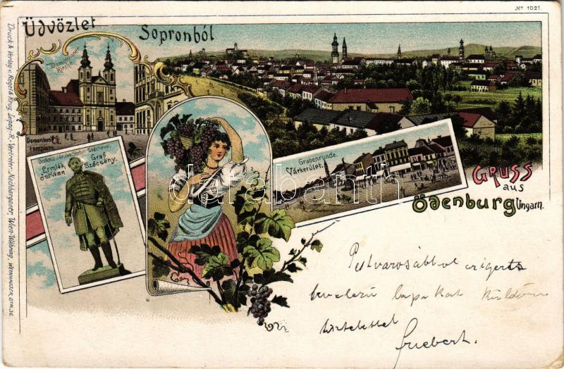 1898 Sopron, Ödenburg; Domonkos templom, Várkerület, Széchenyi István szobor, Szőlős hölgy. Regel & Krug Art Nouveau, floral, litho (Rb)