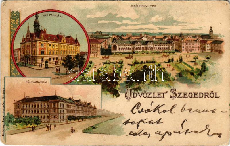 1899 Szeged, Széchenyi tér, MÁV palotája, főgimnázium. Endrenyi Imre kiadása Nr. 1049. Art Nouveau, floral, litho (EB)
