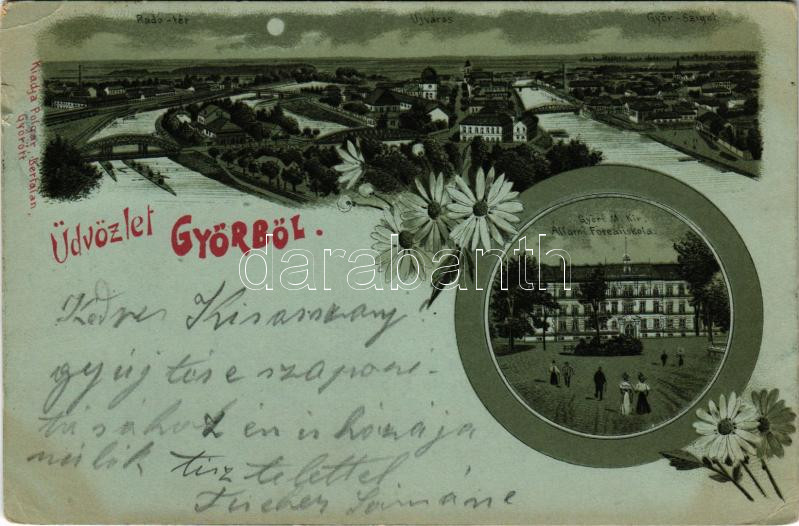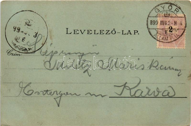1899 (Vorläufer) Győr, Radó tér, Újváros, Győr-Sziget, zsinagóga, híd, M. kir. állami főreáliskola. Polgár Bertalan kiadása. Art Nouveau, floral, litho + "GYŐR ÁLLAM P.U." (szakadás / tear)