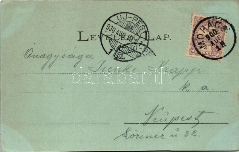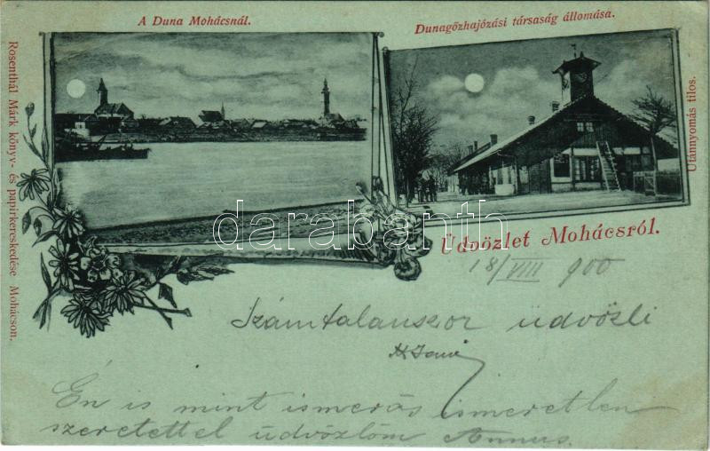 1900 Mohács, Dunagőzhajózási társaság állomása, kikötő, a Duna Mohácsnál este holdfényben. Rosenthal Márk kiadása. Art Nouveau, floral (fl)
