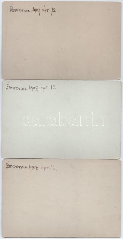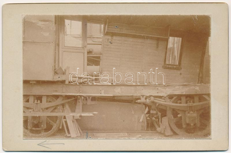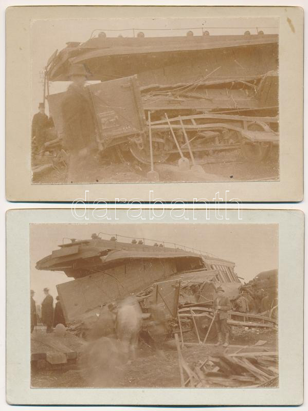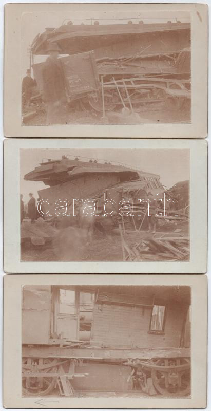 Description: 1907 Kiskundorozsma (Szeged), Dorozsmai vasúti katasztrófa 1907. április 12-én, szétzúzott vonatszerelvények - 3 db eredeti kemény hátú fotó 12 x 16 cm méretben