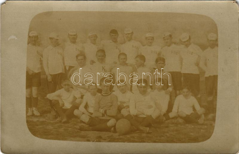 1914 Dévaványa, focisták 'DSC' feliratos mezben és sapkában, labdarúgás, csoportkép. photo (EM)