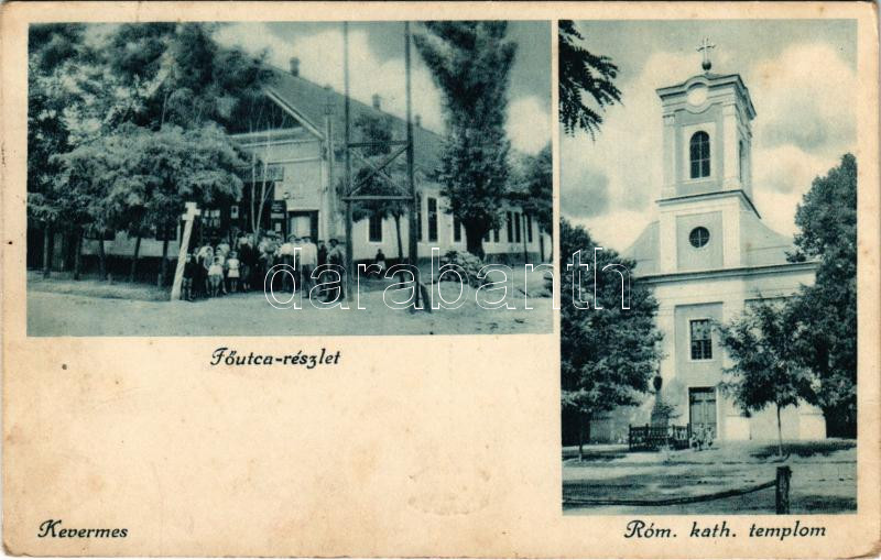 1939 Kevermes, Fő utca, üzlet, Római katolikus templom (fl)