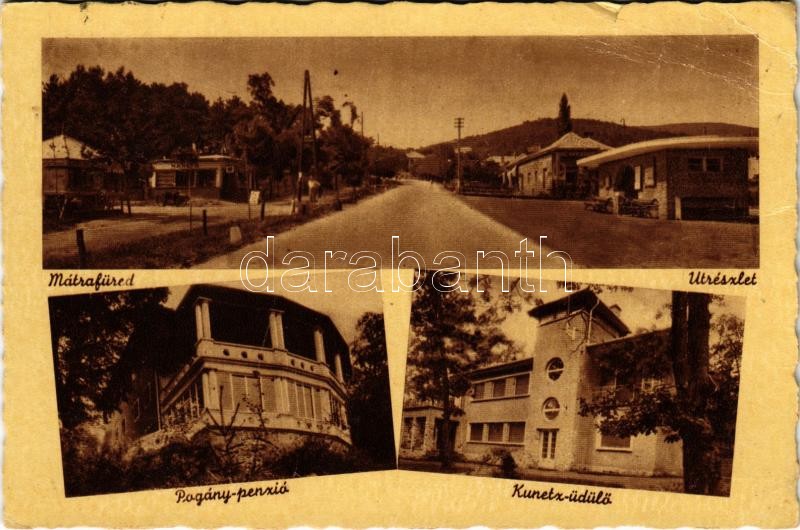 1950 Mátrafüred (Gyöngyös), út részlet, Hangya szövetkezet üzlete, Pogány penzió, Kunetz üdülő (szakadás / tear)