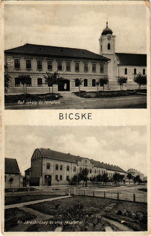 Bicske, Református iskola és templom, Kir. Járásbíróság utca részlette...