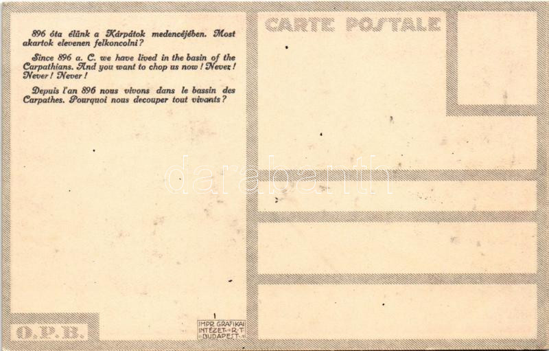 1920 Le Millenaire de la Hongrie. 896 óta élünk a Kárpátok medencéjében. Most akartok elevenen felkoncolni? Kiadja az Országos Propaganda Bizottság. Impr. Grafikai Intézet R.T. / Hungarian irredenta propaganda art postcard, Trianon s: Gara Arnold (EK)