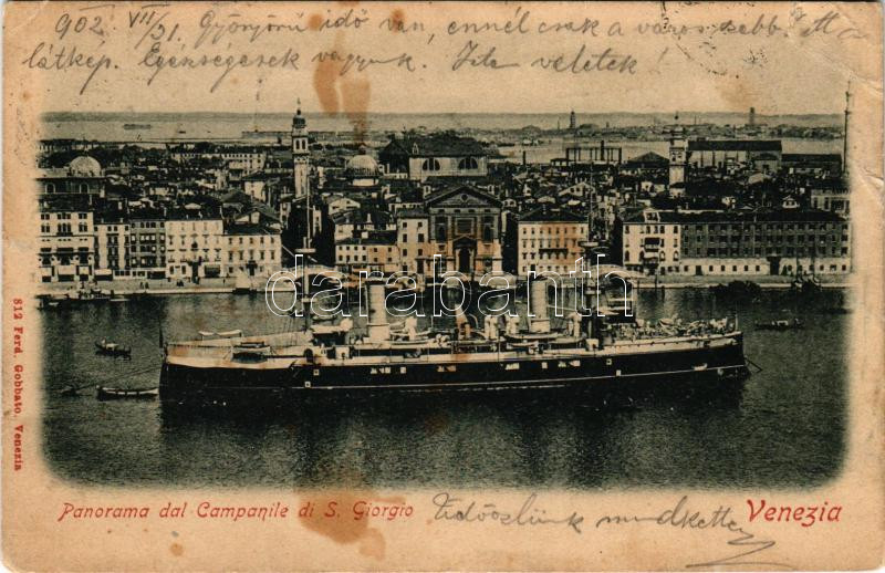 1902 Venezia, Venice; Panorama dal Campanile di S. Giorgio. Ferd. Gobbato / View from Campanile, church, canal, gondola, steamship (tear)