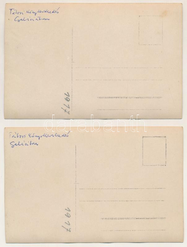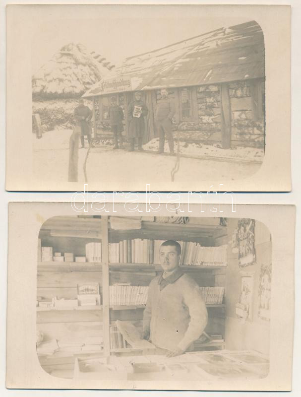 Description: 1917 2 db RÉGI katonai fotós képeslap: tábori könyvkereskedés valahol Galíciában / Feldbuchhandlung / 2 pre-1945 photo postcards: WWI Austro-Hungarian military field book shop somewhere in Galicia