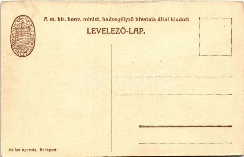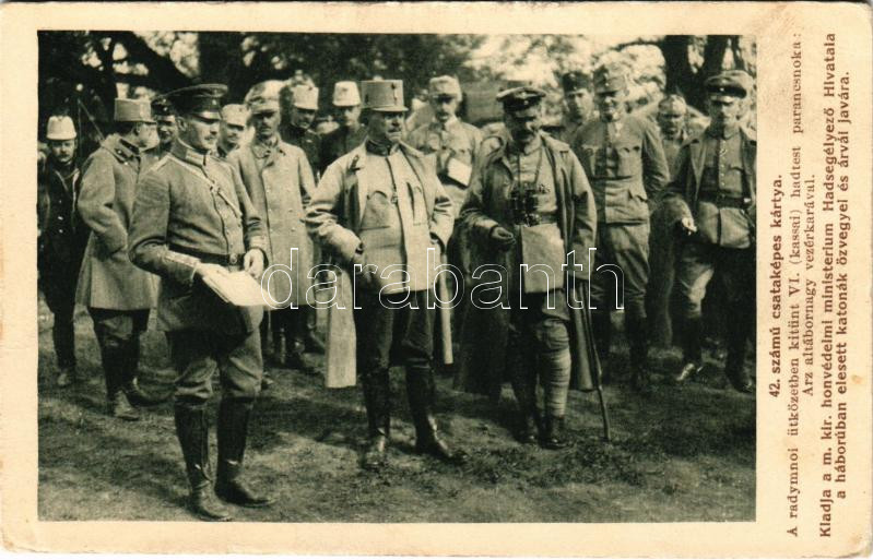 42. számú csataképes kártya. A radymnoi ütközetben kitűnt VI. (kassai) hadtest parancsnoka: Arz altábornagy vezérkarával . Kiadja a M. kir. Honvédelmi Minisztérium Hadsegélyező Hivatala / WWI Austro-Hungarian K.u.K. military, Lieutenant General with his military staff (EK)