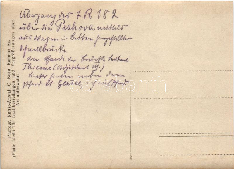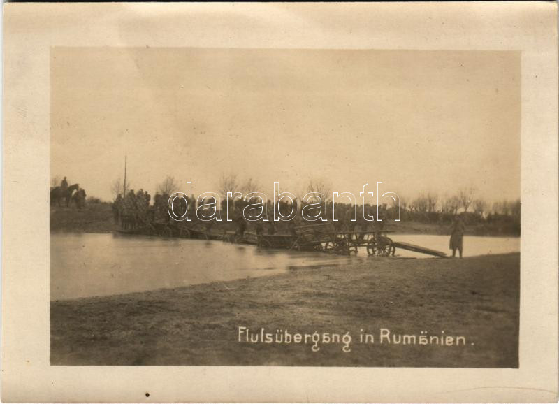 Románia, első világháborús katonák, szekerekből készült híd a Prahova folyó felett / Flussübergang. Foto Kunstanstalt C. Born / Romania, WWI military, soldiers, bridge made of chariots, Prahova river (12,2 x 8,8 cm) (gyűrődés / crease)