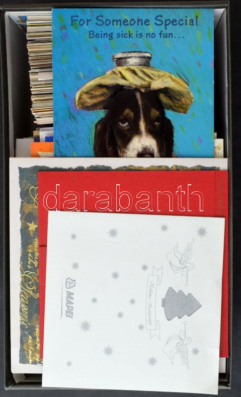 Description: Kb. 650 db MODERN vegyes üdvözlőlap, ünnepek, reklám, művészet, sok egyedivel, kihajthatóval cipősdobozban / Cca. 650 modern mixed greeting cards, art, advertisement in a shoe box