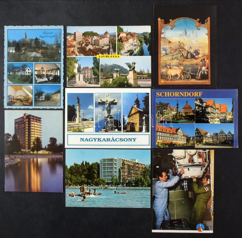 Közel 100 modern képeslap, főleg magyar városképek, pár külföld és motívum (főleg magyar-szovjet űrrepülés)