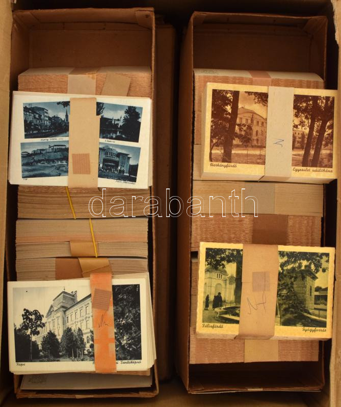 Description: Kb. 6000 db főleg RÉGI Weinstock Ernő város képeslap a történelmi Magyarország területéről, dobozban. - 60 különböző képeslap 100 darabos csomagokban / Cca. 6000 mainly pre-1945 town postcards from the Kingdom of Hungary, in mixed quality - 60 different postcards in packs of 100