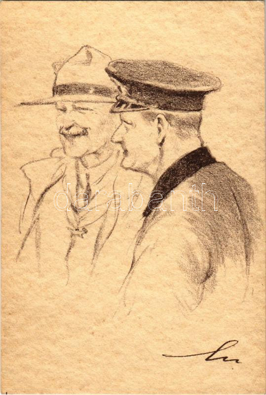 Description: Egyedi, kézzel rajzolt cserkész művészlap, valószínűleg a gödöllői Jamboree idején készült, Lord Baden-Powell / hand-drawn boy scout art postcard, Lord Baden-Powell