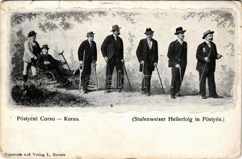 1909 Pöstyén, Pistyan, Piestany; Korzó L. Bernas kiadása / Pistyaner Corso - Stufenweiser Heilerfolg / Gradual healing humour (Rb)