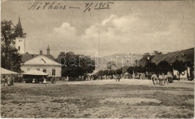 Description: 1915 Héthárs, Lipjany, Lipany; A héthársi római katolikus templom 400 éves fennállásának jubileuma alkalmából. Fő utca, piac. Kirscher Lipót kiadása, Divald Károly fia fénynyomdája / on the occasion of the 400th anniversary of the Catholic church in Lipany. Main street, market (EK)