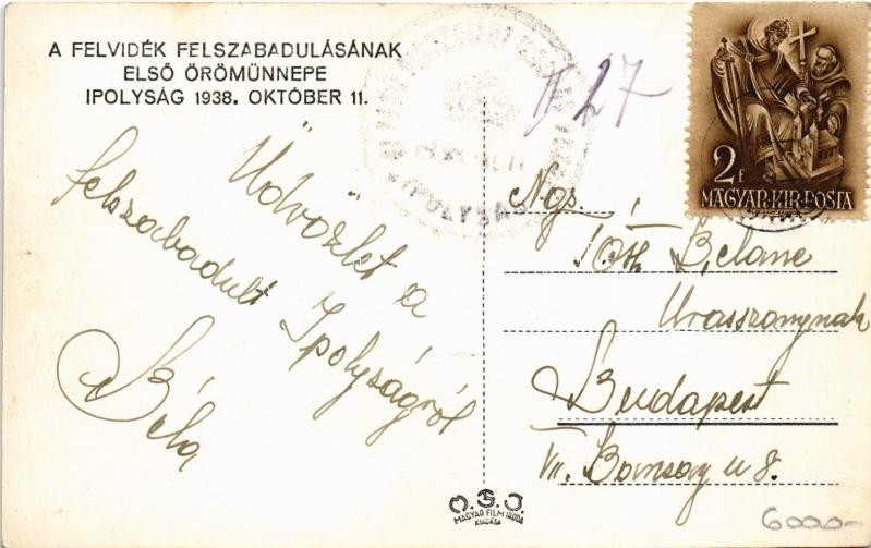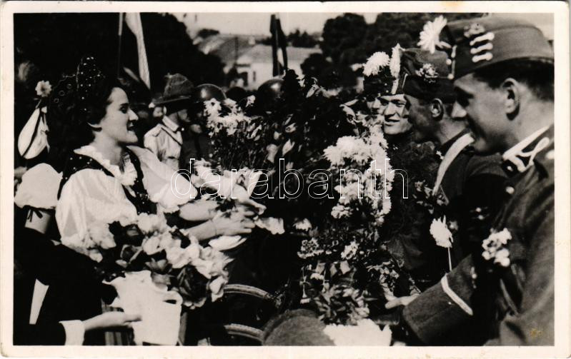 1938 Ipolyság, Sahy; "A Felvidék felszabadulásának első örömünnepe" bevonulás, honleányok virágokkal várják a honvédeket / entry of the Hungarian troops, cheering compatriot women giving flowers to the soldiers + "Az első visszatért magyar város Ipolyság" So. Stpl.