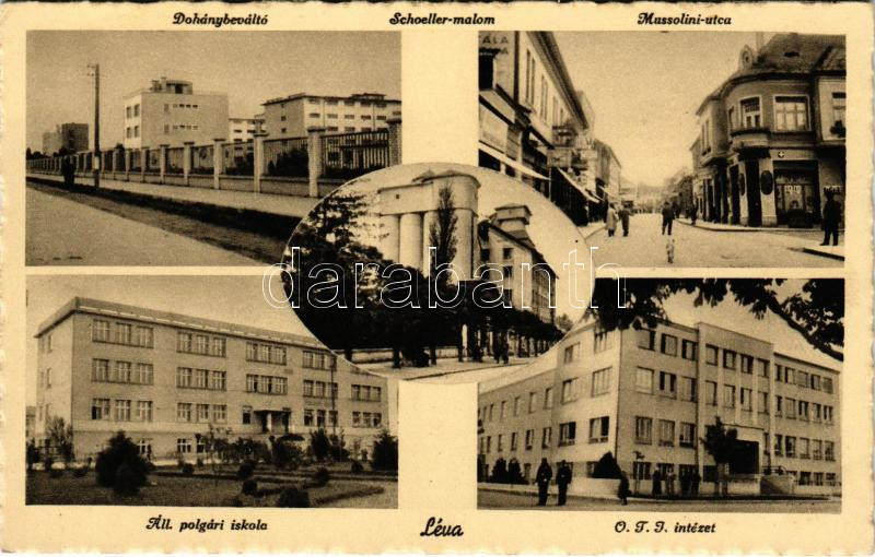 1944 Léva, Levice; Dohánybeváltó, Schoeller malom, Mussolini utca, Állami polgári iskola, OTI intézet / tobacco exchange, mill, street view, shops, school, National Social Security Institute (EK)
