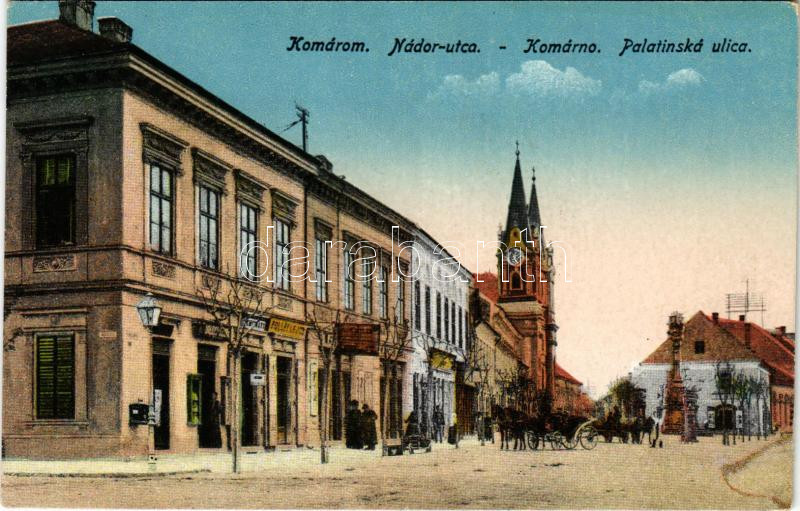 Komárom, Komárnó; Nádor utca, Szentháromság szobor, üzletek. Hermann E...