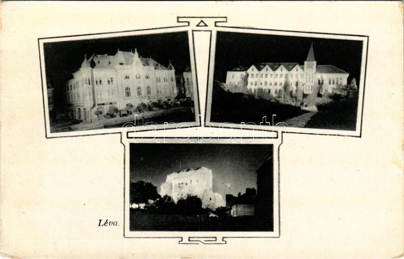 Léva, Levice; Megyeháza, Tanítóképző, várrom este / county hall, teach...