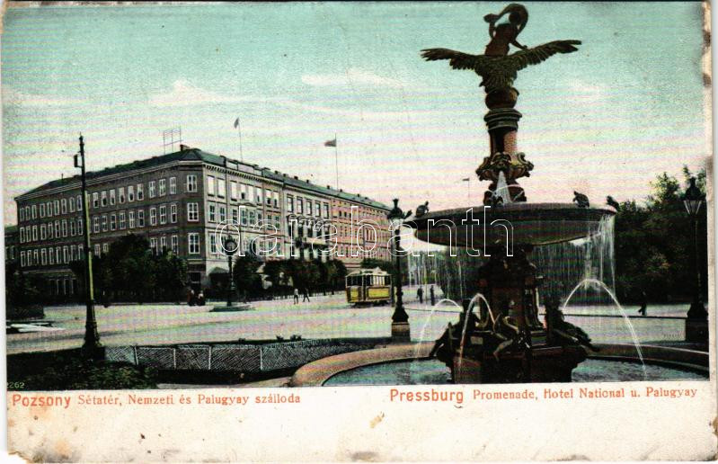 Pozsony, Pressburg, Bratislava; Sétatér, Nemzeti és Palugyay szálloda, villamos, szökőkút. Kaufmann's "Bediene dich allein" / Promenade, Hotel National u. Palugyay / promenade, hotels, tram, fountain (EM)