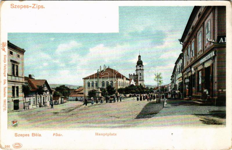 Szepesbéla, Szepes-Béla, Spisská Belá (Szepes, Zips); Fő tér, Gyógyszertár, üzletek. Feitzinger Ede 560. 1902/12. / Hauptplatz / main square, pharmacy, shops (kopott sarkak / worn corners)