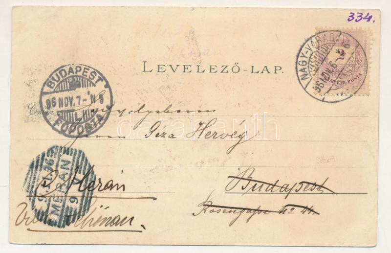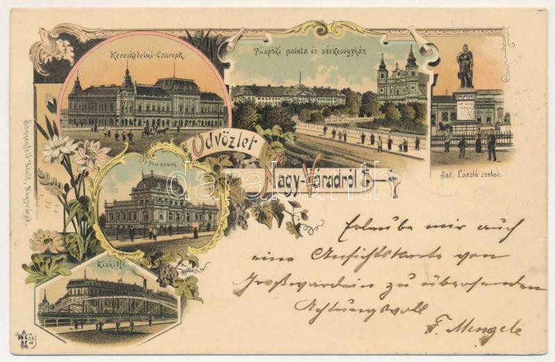 1896 Nagyvárad, Oradea; Kereskedelmi csarnok, Püspöki palota és székesegyház, Szent László szobor, múzeum, kishídfő. Sonnenfeld Adolf kiadása / trade hall, bishop's palace and cathedral, monument, museum, bridge. O.Z.M. Art Nouveau, floral, litho (fl)