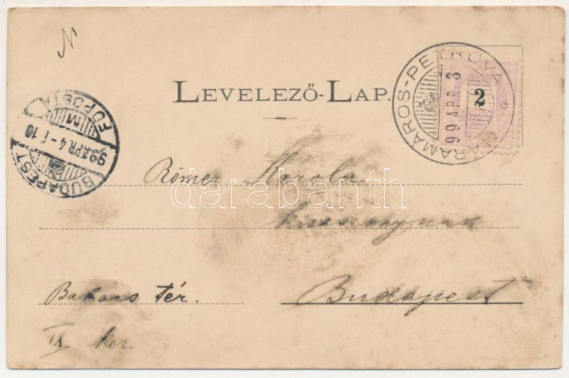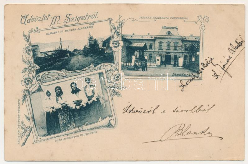 Description: 1899 Máramarossziget, Sighetu Marmatiei; Kamarai út a Magtár állomásig, Osztrák kaszárnya főbejárója, Oláh asszonyok és leányok. Kaufman Ábrahám kiadása / street view, road to the granary station, K.u.K. military barracks, Romanian Vlach folklore. Art Nouveau, floral (fl)