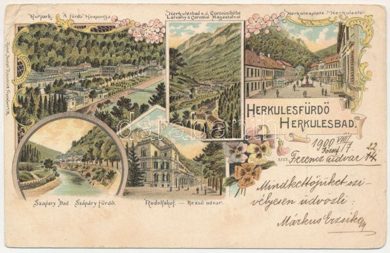 1900 Herkulesfürdő, Baile Herculane; Kurpark, Herkulesbad v. d. Coroninihöhe, Herkulesplatz, Szapáry-Bad, Rudolfshof / A fürdő központja, látvány a Coronini-magaslatról, Herkules tér, Szapáry fürdő, Rezső udvar / spa, general view, square, bath. Kunstanstalt Rosenblatt Art Nouveau, floral, litho (szakadások / tears)