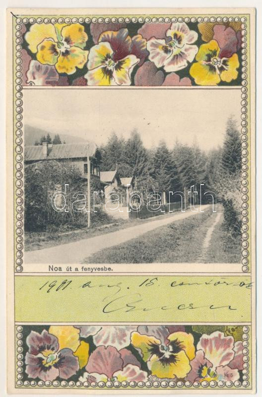 1901 Brassó, Kronstadt, Brasov; Noa, út a fenyvesbe. Szecessziós-virág...