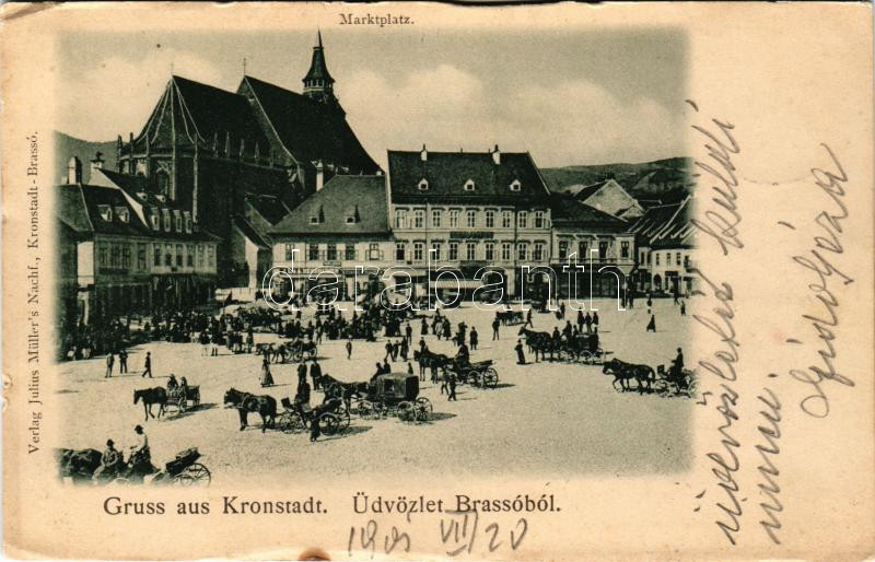 1901 Brassó, Kronstadt, Brasov; Piactér, Albina, J. L. & A. Hesshaimer, Heinrich Wagner, Wilhelm Scherg és Társa üzlete. Julius Müller utóda kiadása / Marktplatz / market, bank, shops (kis szakadások / small tears)