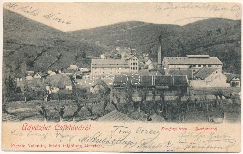 1902 Csiklovabánya, Csiklova, Csiklóbánya, Németcsiklova, Ciclova Montana (Oravica, Oravita); Sörfőző telep, sörgyár. Eiszele Valentin kiadása / Bierbrauerei / brewery, beer factory + "ORAVICZA - JASSENOVA 210. SZ." vasúti mozgóposta bélyegző (fl)