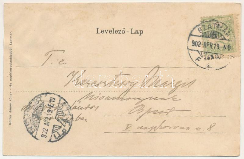 Description: 1902 Szatmárnémeti, Szatmár, Satu Mare; látkép, zsinagóga. Reizer János kiadása. Szecessziós lóherés litho keret / general view with synagogue. Art Nouveau, litho frame with clovers (r)