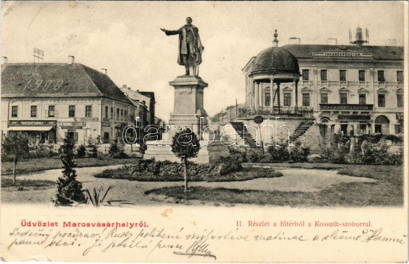 1904 Marosvásárhely, Targu Mures; Fő tér, Kossuth szobor, Bodor kút, Takarékpénztár, Bartscht Károly, Henning Károly, Falkenstein Ödön üzlete / main square, monument, well, shops, savings bank (EK)