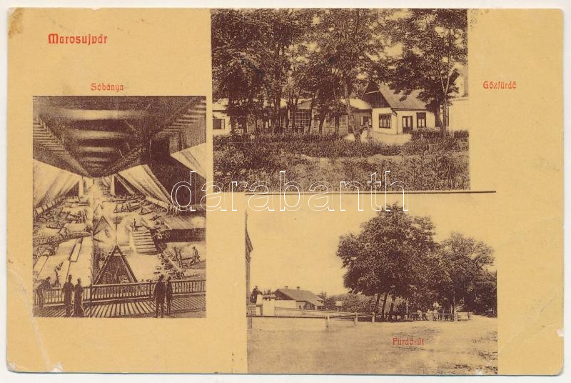 1909 Marosújvár, Uioara, Ocna Mures; Sóbánya, Gőzfürdő, Fürdő út. Grün Géza kiadása / salt mine, steam bath, street (EB)