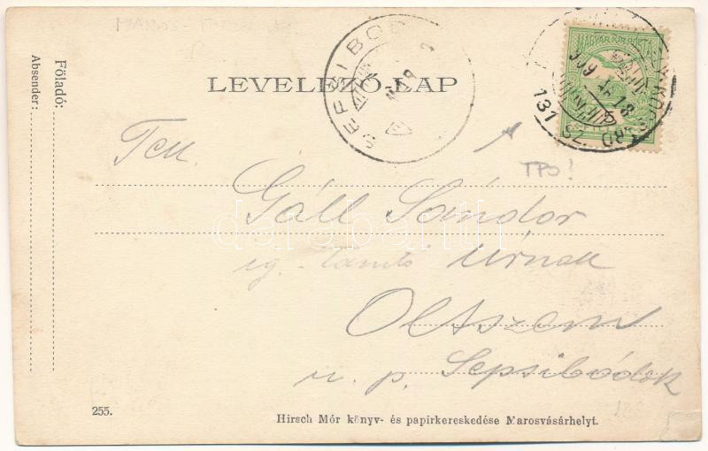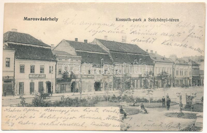 Description: 1909 Marosvásárhely, Targu Mures; Kossuth Park és Széchenyi tér, Peteli János, Nuridsányi János, Izmael Márton, Lichter G. és Dudutz Ferenc üzlete, szállítási vállalat. Hirsch Mór kiadása / park and square, shops + "MAROS-VÁSÁRHELY - KOCSARD 131. SZ." vasúti mozgóposta bélyegző (szakadás / tear)