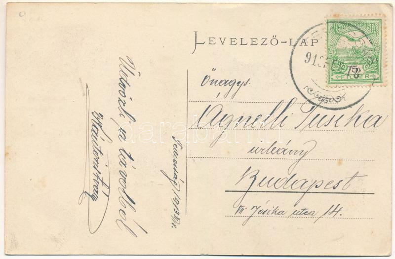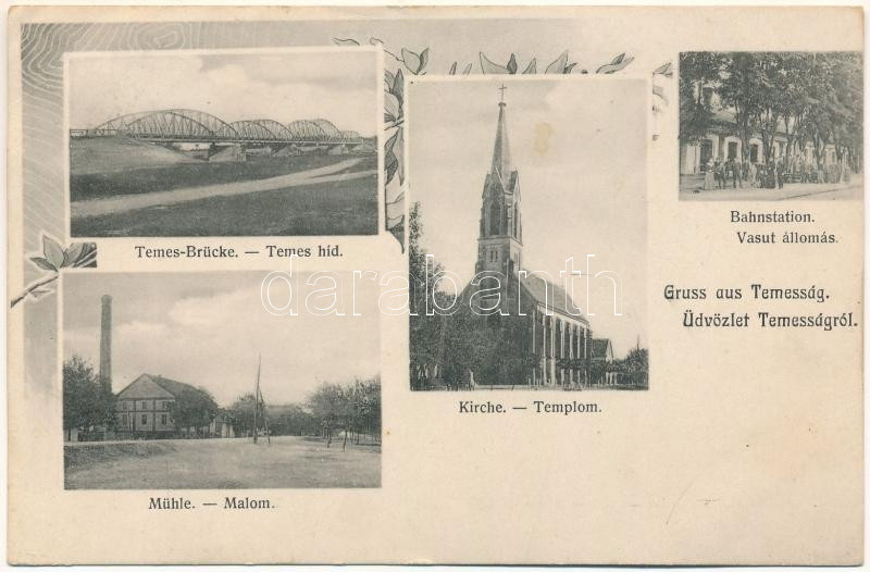 1913 Temesság, Saágh, Dreispitz, Sag; Temes-Brücke, Bahnstation, Mühle, Kirche / Temes híd, Vasútállomás, Templom, Malom / bridge, railway station, mill, church. Floral (EK)