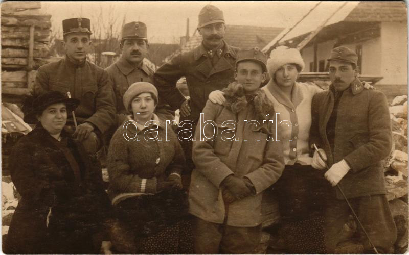 Description: 1915 Ditró, Gyergyóditró, Gyó-Ditró, Ditrau; osztrák-magyar katonák hölgyekkel télen karácsony környékén / WWI K.u.K. military, soldiers with ladies in winter around Christmas. photo (fl)