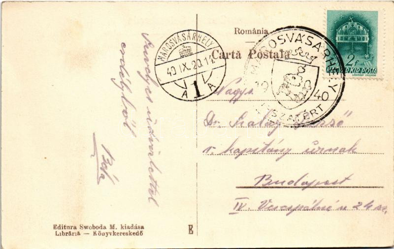 Description: 1940 Csíkszereda, Miercurea Ciuc; Ferdinánd király utca. Swoboda M. kiadása / Strada Regele Ferdinand / street + "1940 Marosvásárhely visszatért" So. Stpl