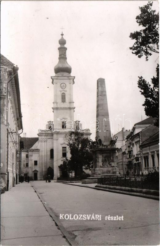 Kolozsvár, Cluj; tér és Ferenciek temploma, Ínség szobor. Kovács Géza üzlete / church, square, statue, shop. photo (ragasztónyom / gluemark)