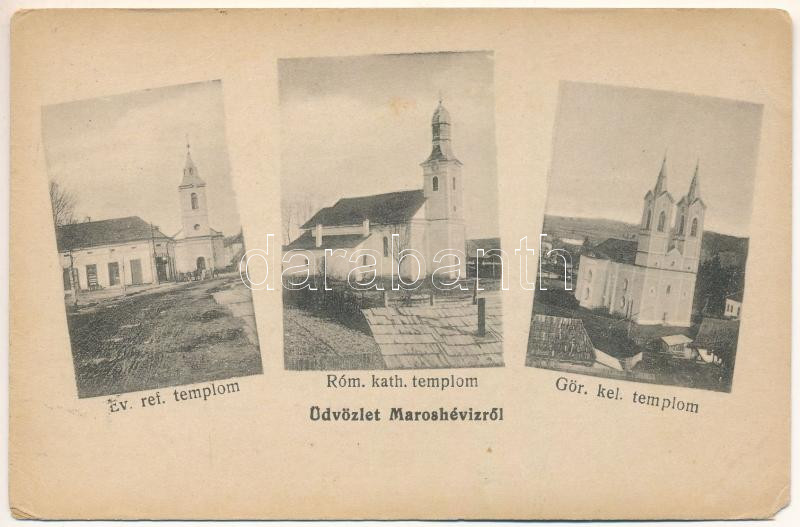 Description: Maroshévíz, Oláhtoplica, Toplita; Református, Római katolikus és Görögkeleti templom. Walter Ede kiadása / Calvinist, Roman Catholic and Greek Orthodox church (EM)