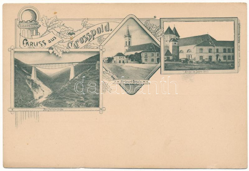 Nagyapold, Grosspold, Apoldu de Sus; Teufelsbrücke, Kirche und Schule, Kirche im Jahre 1860 / Ördög vasúti híd, templomok, iskola. And. Glatz / railway bridge, churches, school. Art Noueau, floral (Rb)