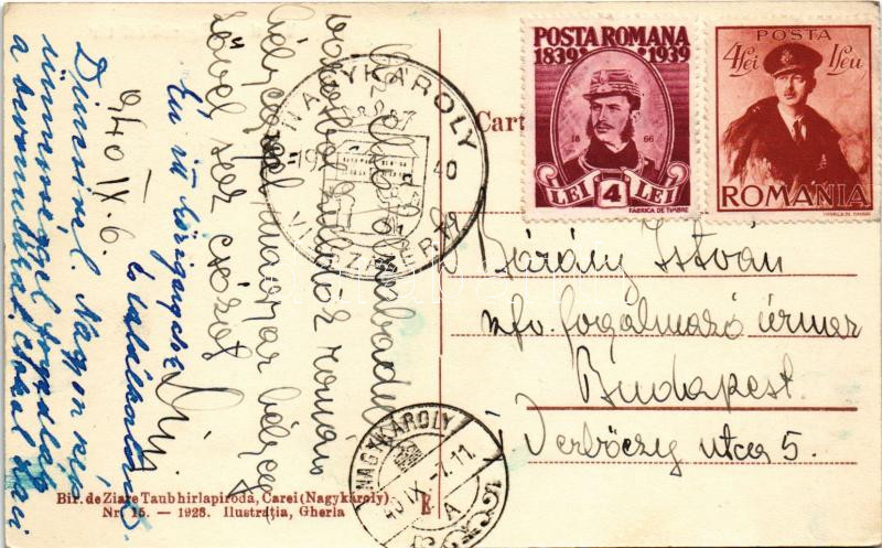 Nagykároly, Carei; Egyesülési tér, Egeli J. üzlete. Taub kiadása / Piata Unirei / square, shops + "1940 Nagykároly visszatért" So. Stpl.