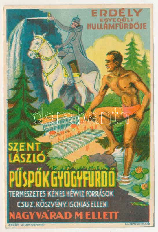 Püspökfürdő, Szentlászlófürdő, Baile 1 Mai, Episcopiei (Nagyvárad, Oradea); Erdély egyedüli hullámfürdője! Szent László Püspökgyógyfürdő Nagyvárad mellett. Felelős kiadó Komzsik Alajos. Erdély litogr. reklámlap / "The only wave pool in Transylvania!" spa and bathing hall near Oradea. Tourist advertising art postcard, litho s: Ványai