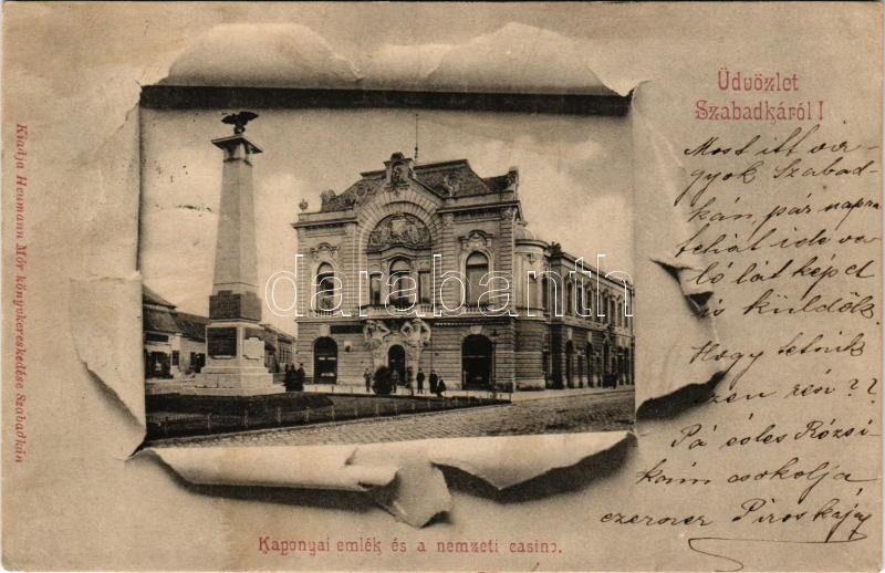 1900 Szabadka, Subotica; Honvéd emlékmű (Kaponyai csata emlékműve), Nemzeti Kaszinó. Heumann Mór kiadása / Hungarian military monument, casino (fl)