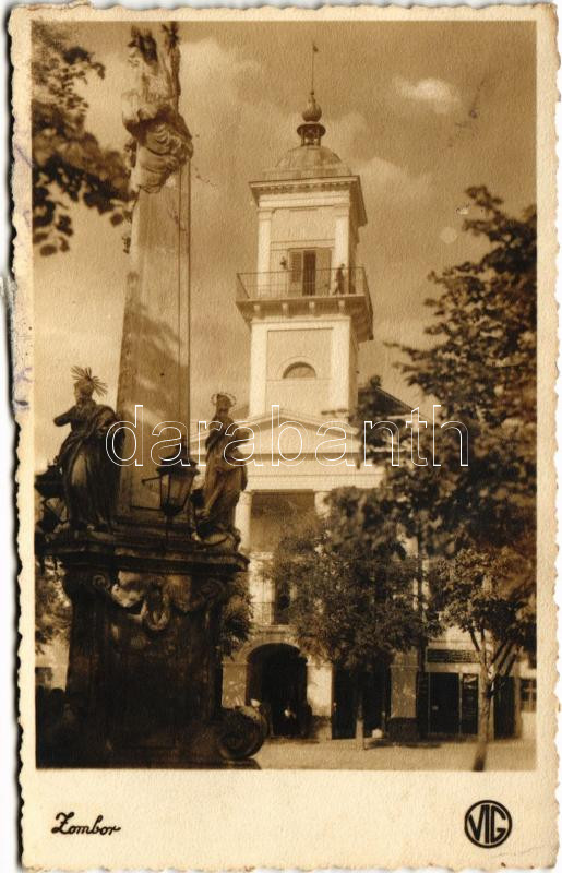Zombor, Sombor; Városháza, Szentháromság szobor, üzlet / town hall, Trinity statue, shop. photo
