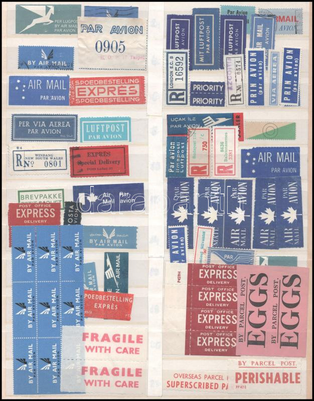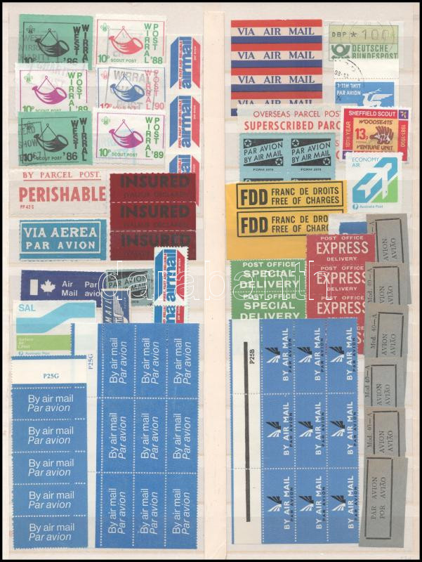 126 db ragjegy, főleg légiposta, sok használatlannal, rendező berakólap mindkét oldalán