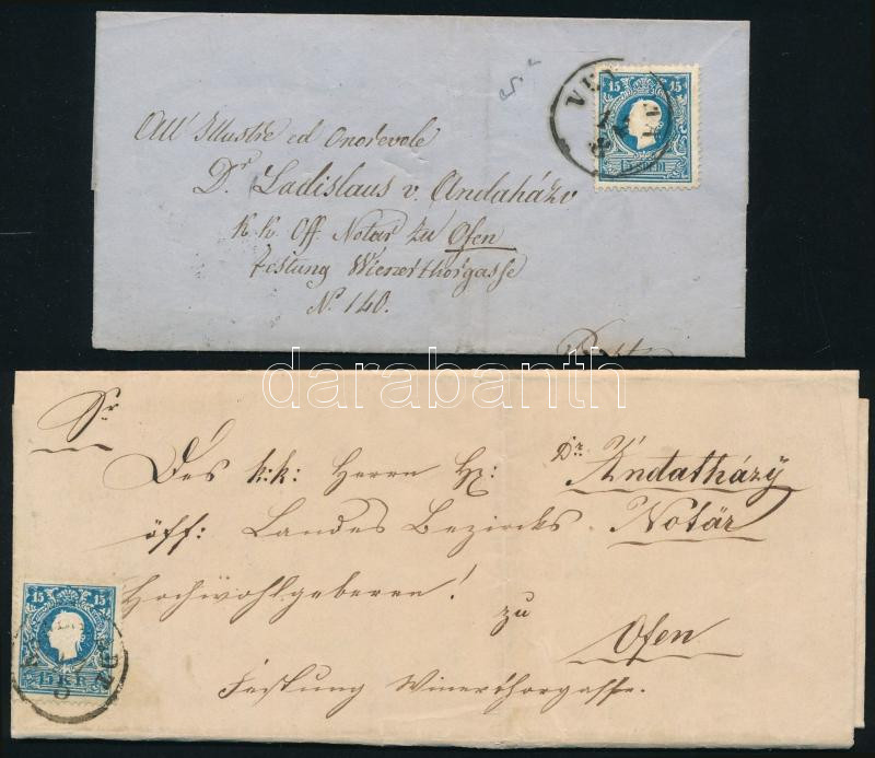 1858 2 db levél Andaházy jegyzőnek Budára "KARLSTADT" és "VENEZIA" bélyegzésekkel